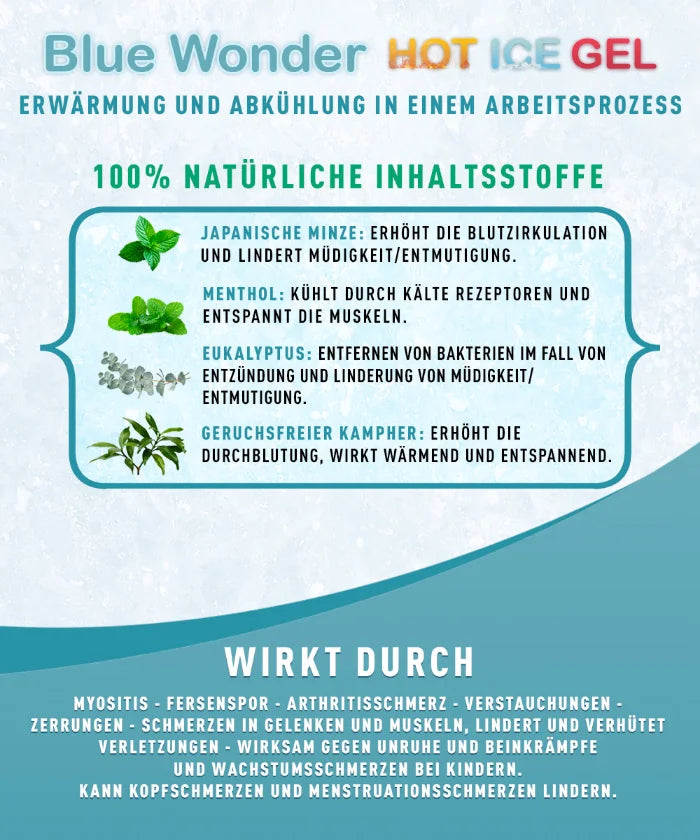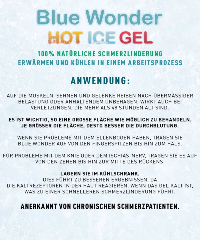Praktisch in der Handhabung, leicht zu öffnen und easy zu benutzen. Einfach das Gel mit der Kugel gleichmäßig auf die schmerzende Stelle auftragen und einziehen lassen. Für alle, die ganz einfach dosieren und schnell in den Genuss des Blue Wonder Hot Ice Gels kommen und ganz natürlich Schmerzen lindern wollen!